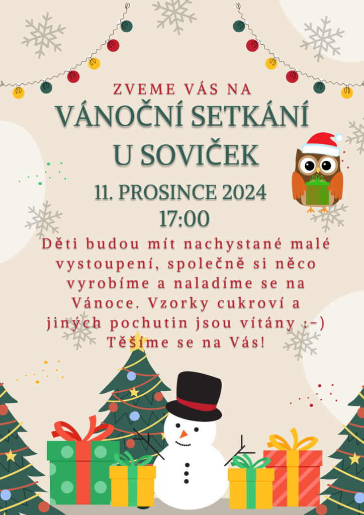 Na vánočním setkání u Soviček se 11. prosince 2024 od 17:00 můžete těšit na vystoupení dětí a společné tvoření. Přineste vzorky cukroví a užijte si předvánoční atmosféru!